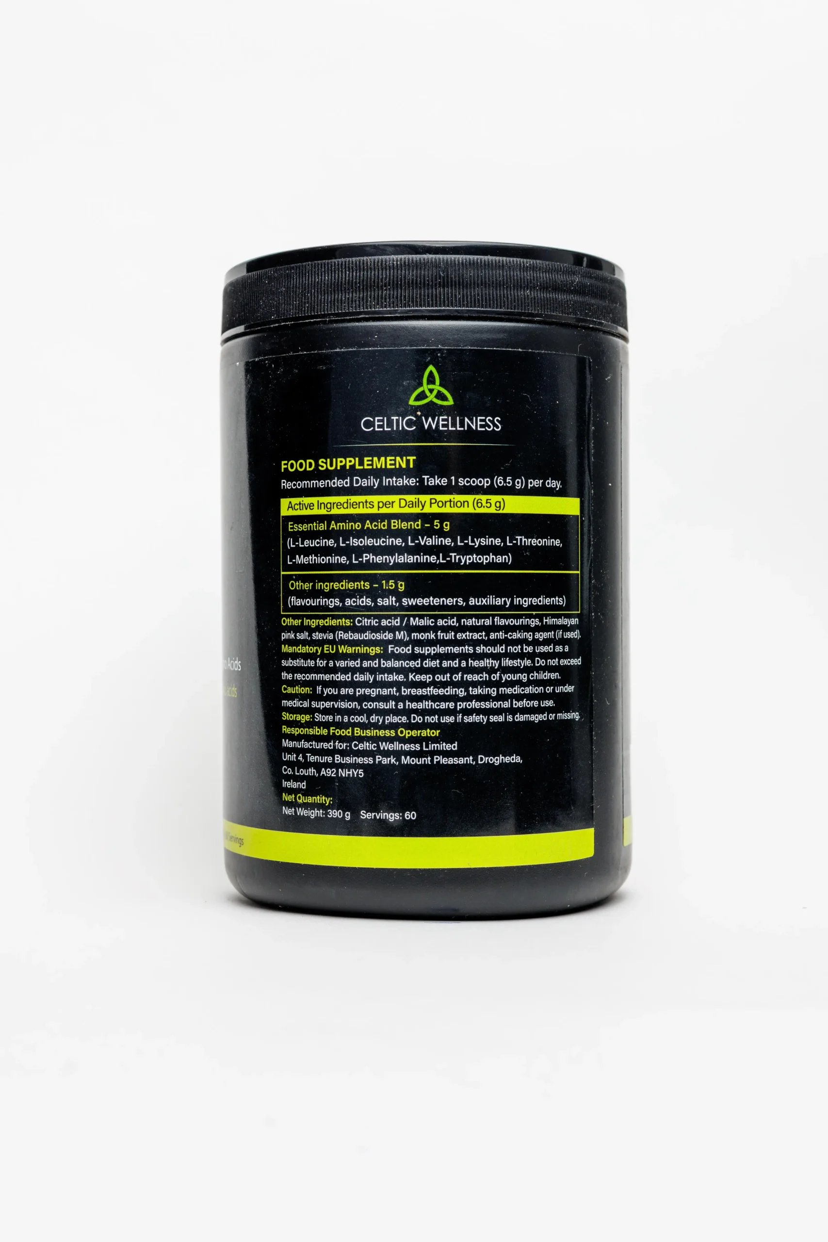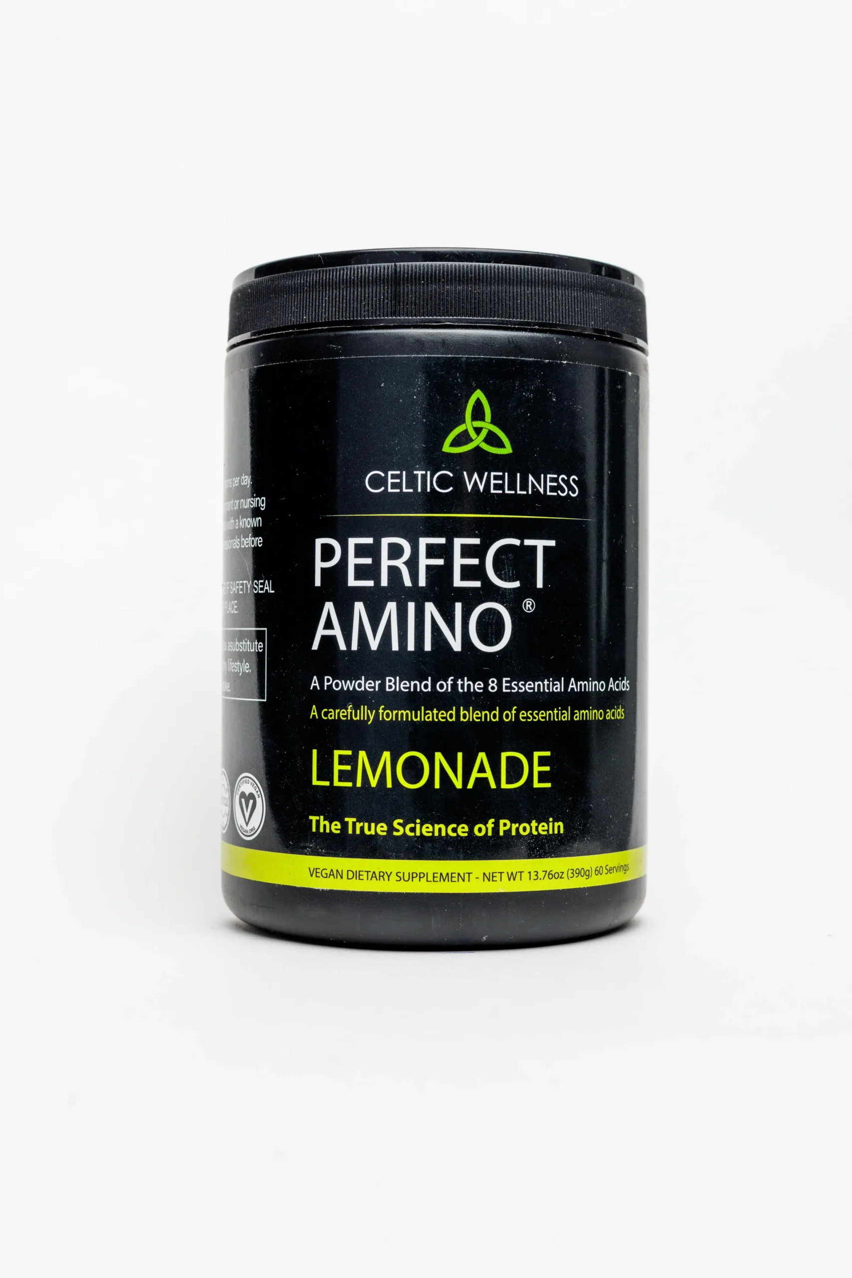Celtic Wellness Perfect Amino Lemonade is a vegan dietary supplement containing a carefully balanced blend of the eight essential amino acids the body needs but cannot produce independently.